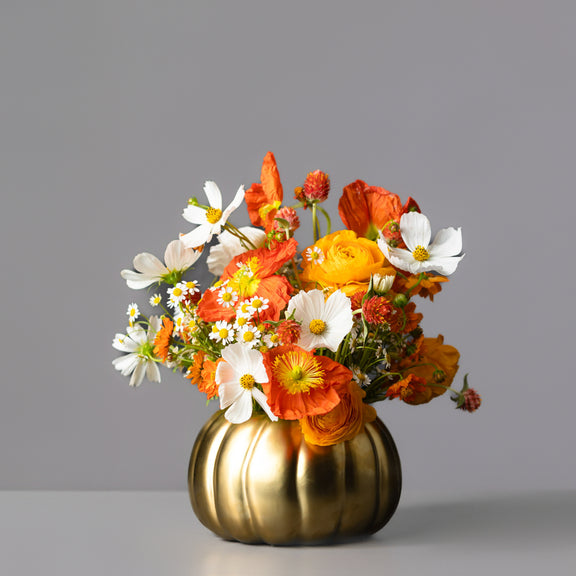 A festive mix of orange poppies, ranunculus, and wildflowers arranged in a gold pumpkin vase.