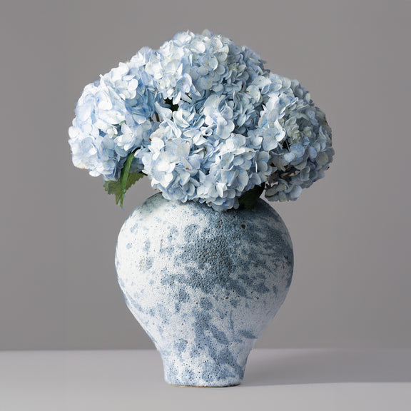 Soft blue hydrangeas gathered in a textured ceramic vase. Elegant and classic for home or gifting.