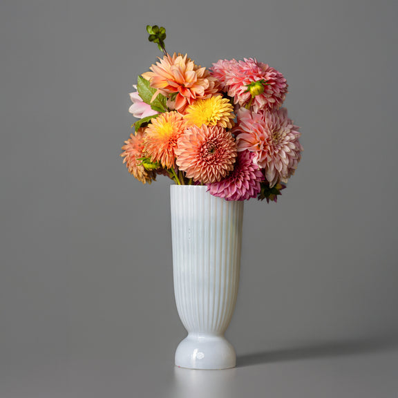 A stunning dahlia mix bouquet in warm shades of pink, orange, and yellow, styled in a tall glass vase. Rare mixes that are here and gone!