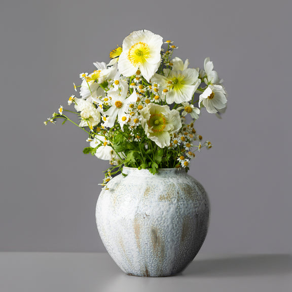 Bright white poppies paired with chamomile-style blooms, arranged in a rustic white urn.